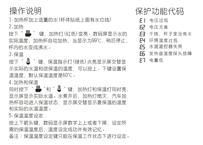 特點(diǎn): 數(shù)字溫度顯示,采用厚膜加熱技術(shù),顯著提升加熱性能,雙層不銹鋼杯體和真空保溫技術(shù),降低熱量耗散速度,外觀采用人體工學(xué)和實(shí)用相結(jié)合的設(shè)計(jì)。