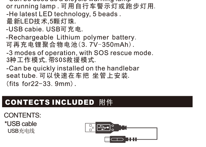 特性:LED技術(shù),5顆大燈珠,實(shí)現(xiàn)整體流暢設(shè)計(jì)和高亮照射;同時(shí)通過脈沖模式實(shí)現(xiàn)人性化設(shè)計(jì);配備USB接口,可循環(huán)充電;三種模式可循環(huán)切換,配有SOS模式;硅膠捆扎固定方式,方便拆卸安裝;方型背扣設(shè)計(jì),可橫向和縱向不同角度安裝;可安裝在坐管,車把手,前叉等。