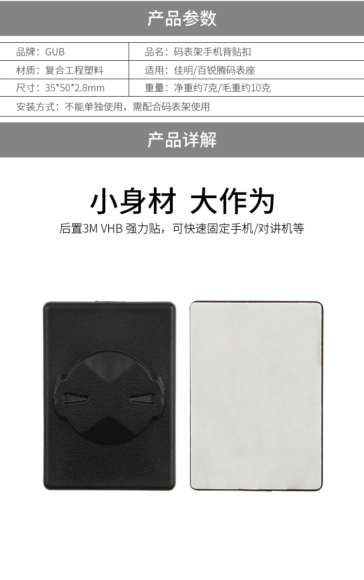 名稱:GUB 碼表座背貼扣 適用:手機、對講機等 材質:復合工程材料 規(guī)格:佳明/百銳騰 重量:約7克(凈重)/約10克(毛重) 統(tǒng)一零售價:12元