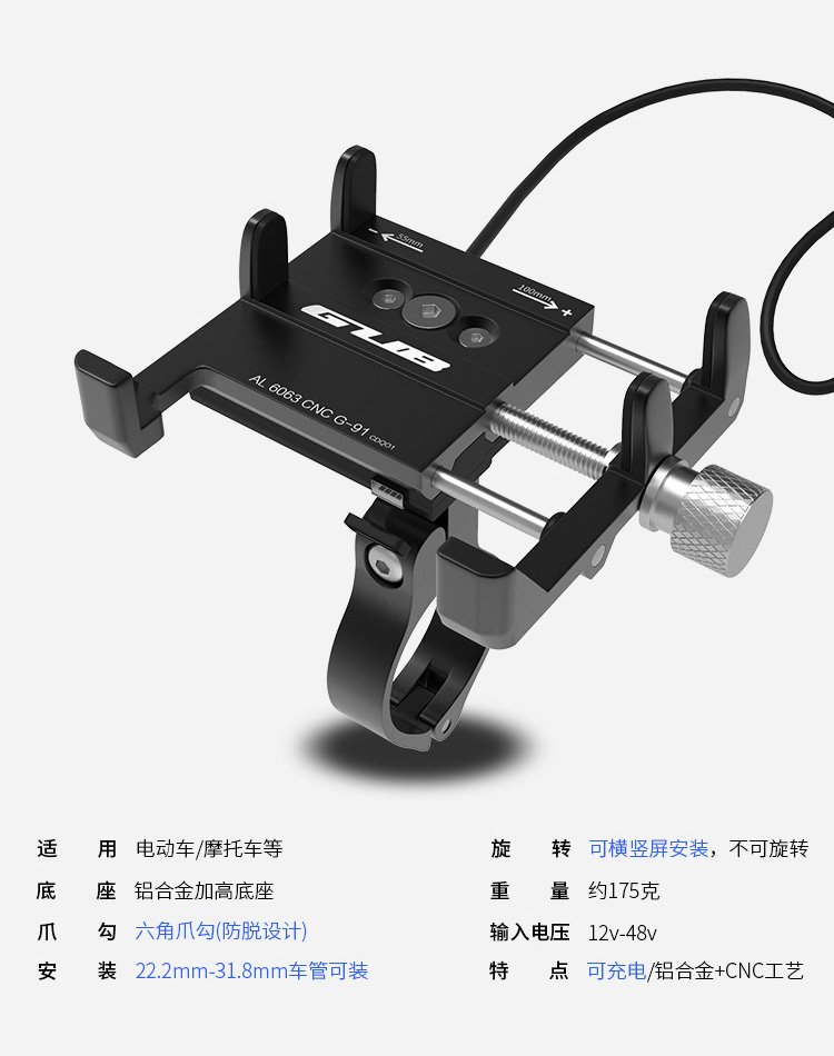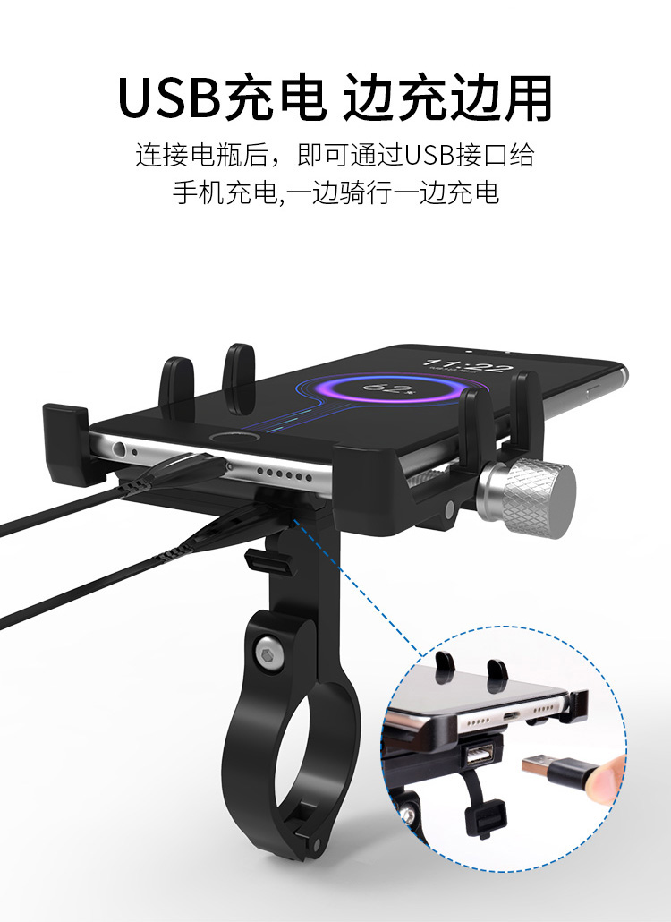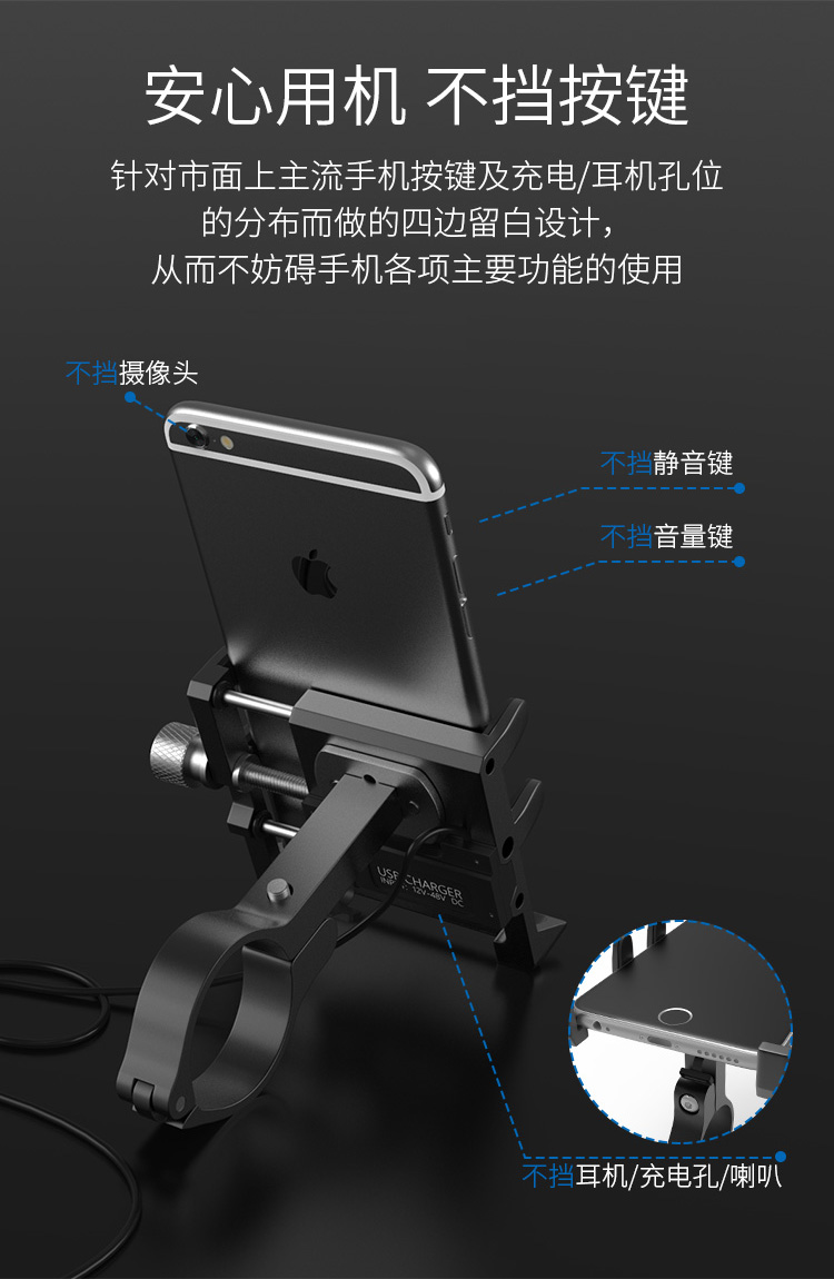 特點(diǎn):全鋁合金架體,四對(duì)位加長(zhǎng)固定部+強(qiáng)化底托,更標(biāo)配穩(wěn)固綁帶,高兼容性不挑手機(jī)型號(hào),連接電瓶后可為手機(jī)充電,摩托車(chē)/電動(dòng)車(chē)等都可使用!