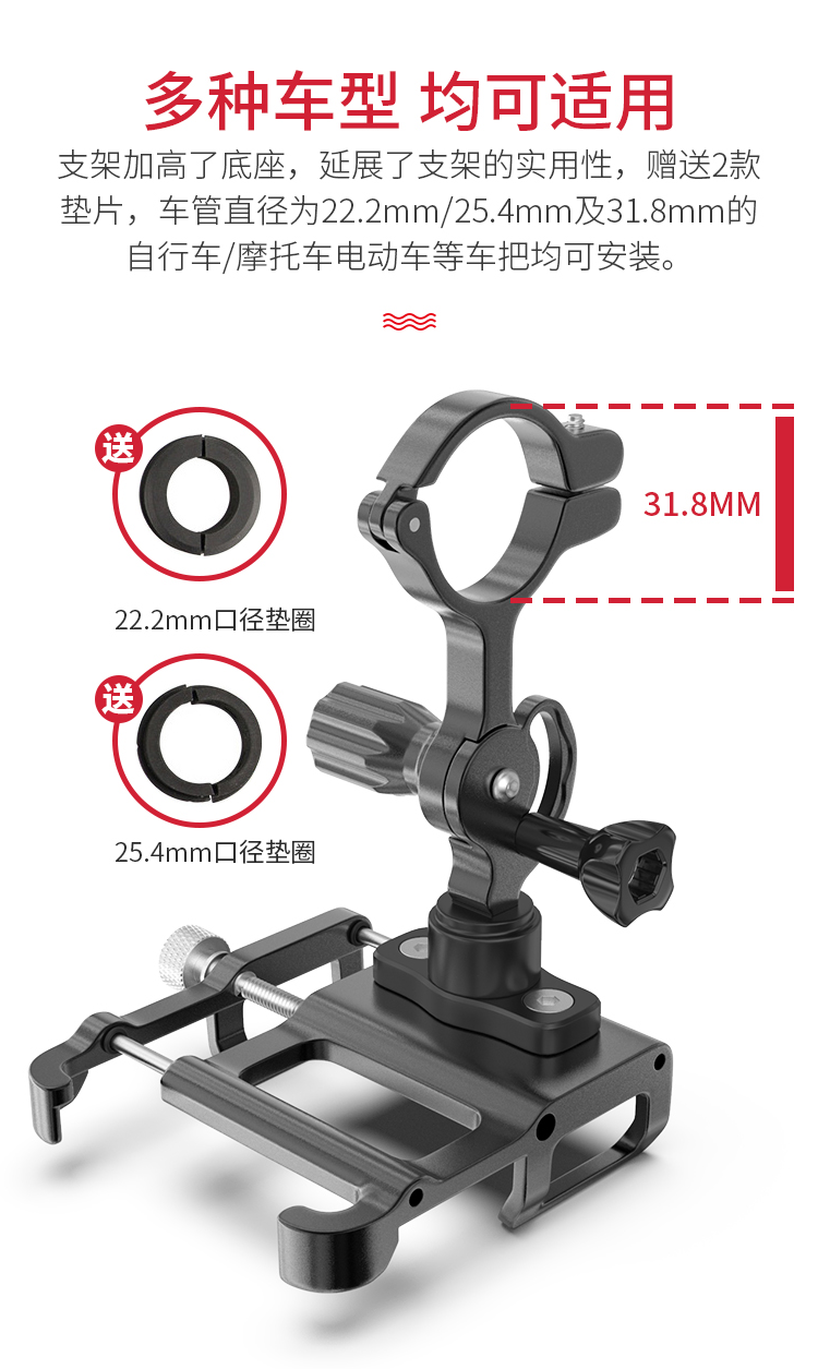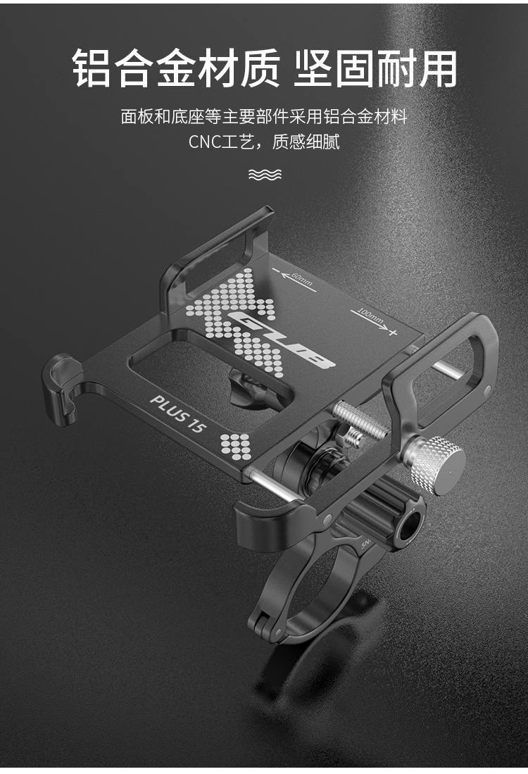 特點:鋁合金架體,雙緊固旋鈕拒絕抖動,高兼容性不挑手機型號,自行車、電動車等都可使用!