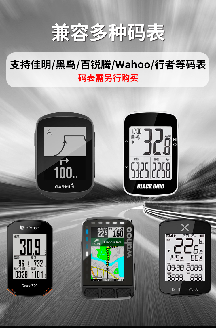 支持碼表:GARMIN全系列(兼用行者/黑鳥/iGPS等),貓眼全系列,百銳騰系列,wahoo系列