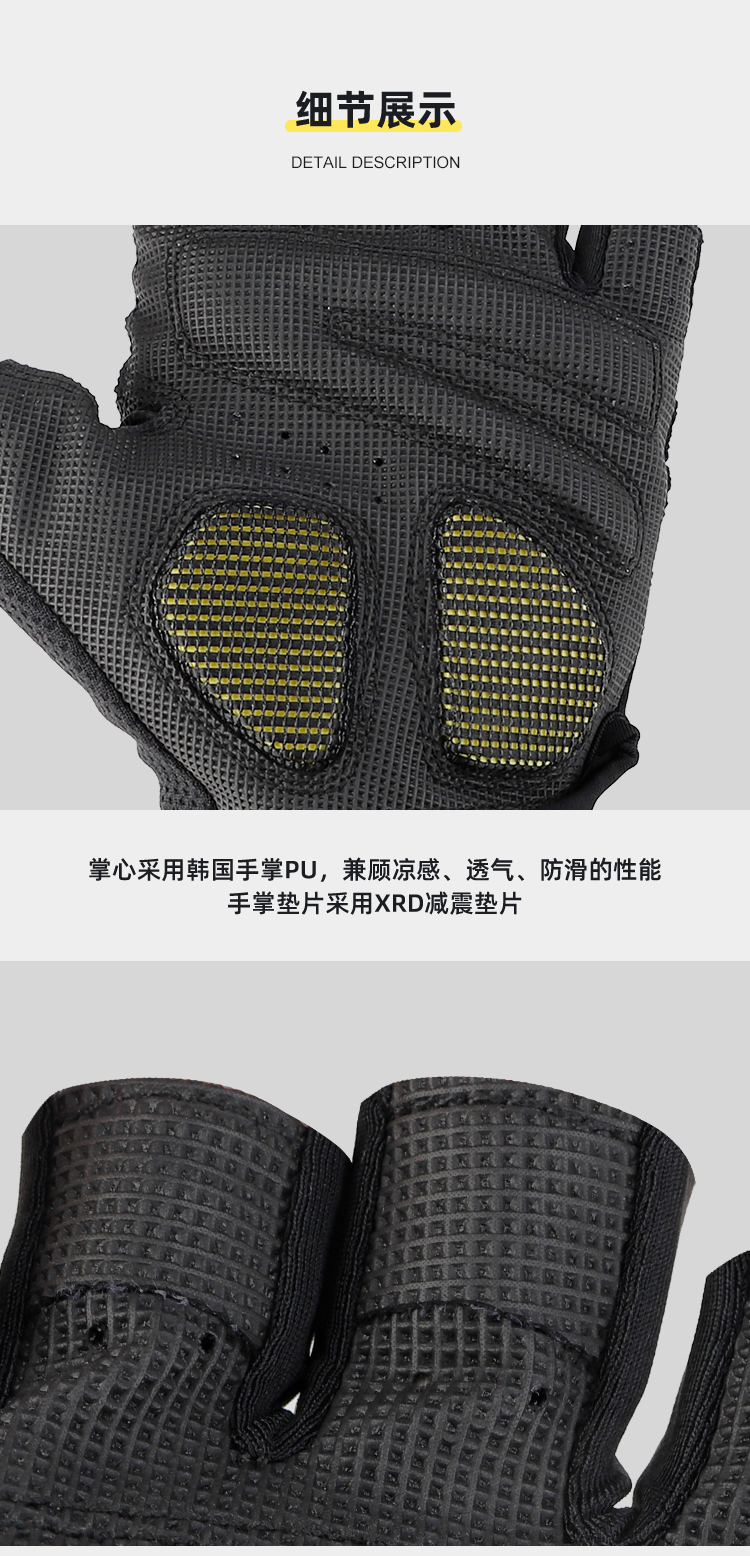 材質(zhì):高彈萊卡方格面料、進(jìn)口PORON XRD 緩沖掌墊、掌心采用韓國(guó)進(jìn)口PU、韓國(guó)Aerosilver抗菌面料(擦汗布)