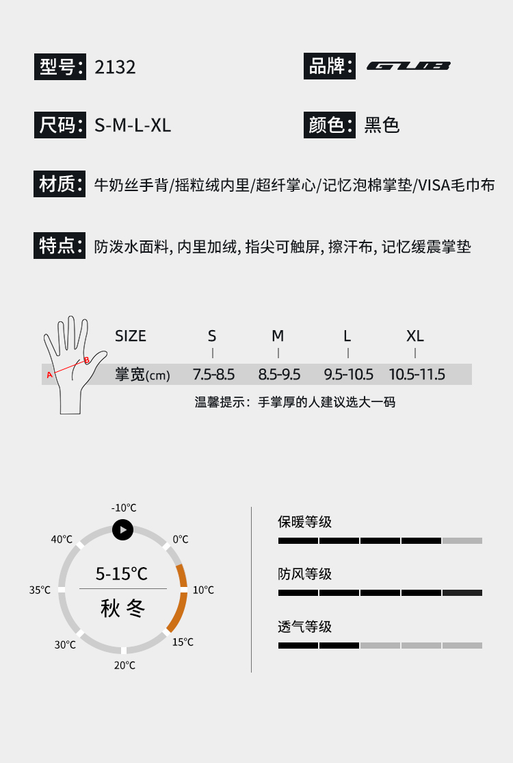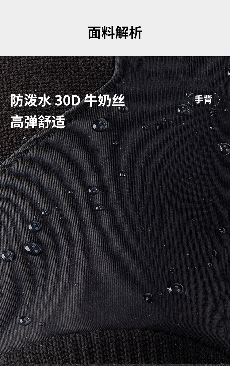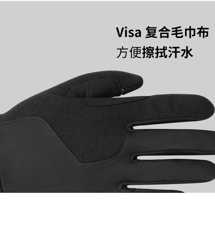 材質(zhì):30D牛奶絲手背、搖粒絨內(nèi)里、超纖手掌、3MM記憶掌墊、Visa擦汗布、拇指食指導電布