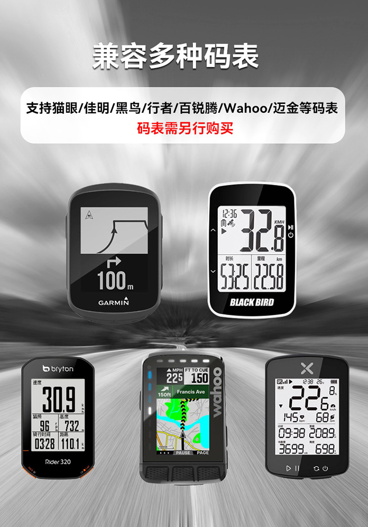 支持碼表:GARMIN全系列(兼用行者/黑鳥/iGPS等),貓眼全系列,WAHOO系列,百銳騰系列,邁金系列