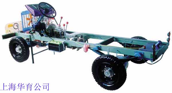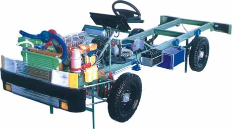 本品選用透明有機(jī)玻璃制作,內(nèi)中部件均以硬質(zhì)塑料料加工,用 螺絲固定在金屬高溫烘漆而成的車架上。各總成部分都以壓模成形加 工,代替過去膠粘合的方法,使產(chǎn)品在強(qiáng)度上有很大提高。發(fā)動(dòng)機(jī)總成用電機(jī)驅(qū)動(dòng),在油門處設(shè)有調(diào)速裝置,能演示發(fā)動(dòng)機(jī)轉(zhuǎn)速高低。離合器分離明顯,操縱靈活,離合器外殼整體壓模而成,變速箱和各檔齒輪用各種顏色表示,換檔靈活,手制動(dòng)美觀。后橋外形壓模而成,內(nèi)中主減速、差速轉(zhuǎn)動(dòng)自如,輪轂剎蹄壓模成型,剎蹄可調(diào)節(jié),前橋輪鼓可調(diào)整,轉(zhuǎn)向裝置以及電瓶、油箱、水箱,制動(dòng)管路分布清楚一目了然。電路采用對(duì)插件前后分布,燈架、風(fēng)窗、儀表板、后燈架用透明有機(jī)玻璃壓模成整體美觀逼真。